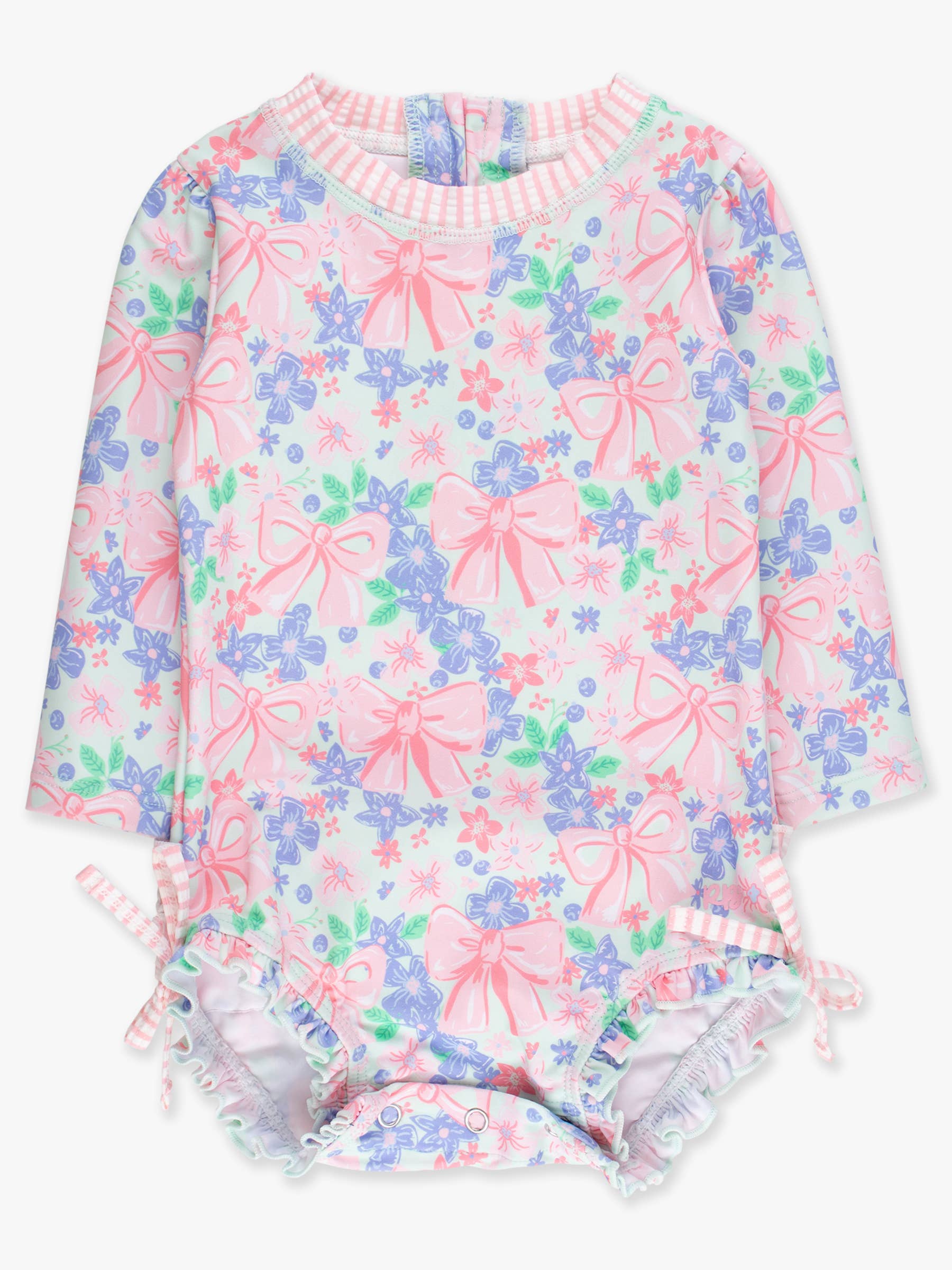 A charming addition to your little girl's swimwear collection from RuffleButts, this bestselling baby one-piece blends comfort, style, and sun protection effortlessly. Made from soft, UPF 50+ fabric, it offers all-day coverage and peace of mind under the sun. Designed with convenience in mind, it features a back zipper and bottom snaps for quick and easy changes. Thoughtful details like playful leg ruffles, sweet bow accents, and our signature rear ruffles add the perfect finishing touch to this adorable swimsuit. Sweet as springtime, this whimsical print is sprinkled with pink bows, dainty blossoms, and tiny blueberries, all scattered across a soft green backdrop. It's cheerful, girly, and full of charm—like a garden party wrapped in a bow. Perfect for little ones who love all things cute, colorful, and full of joy. Pairs well with Mint, Pink, Bubblegum Pink, and Periwinkle Blue.