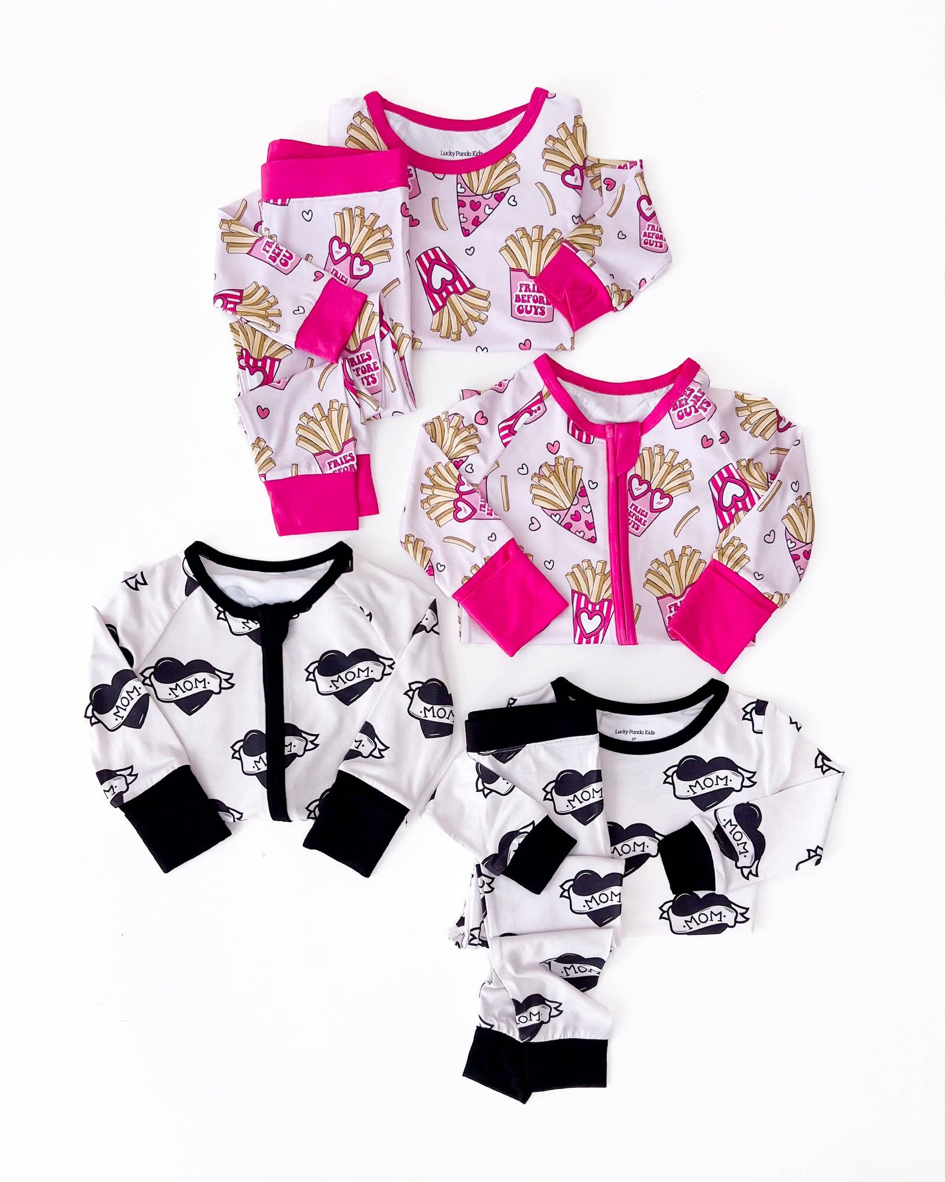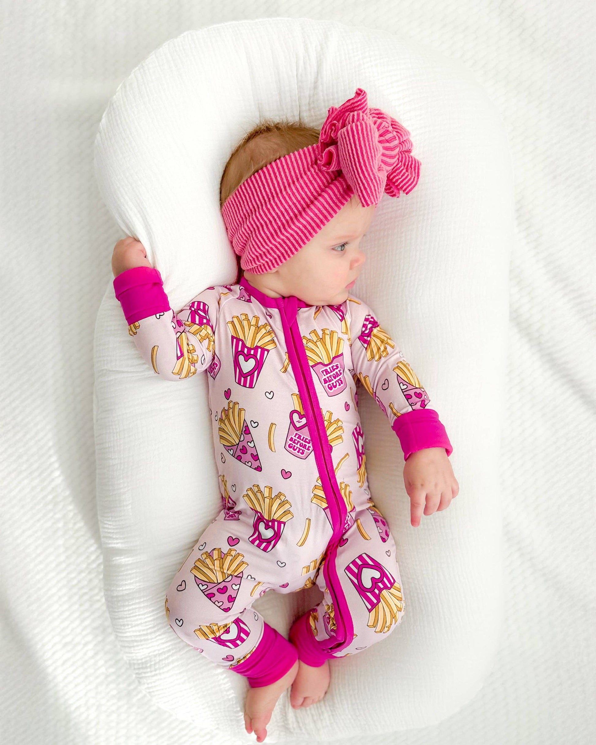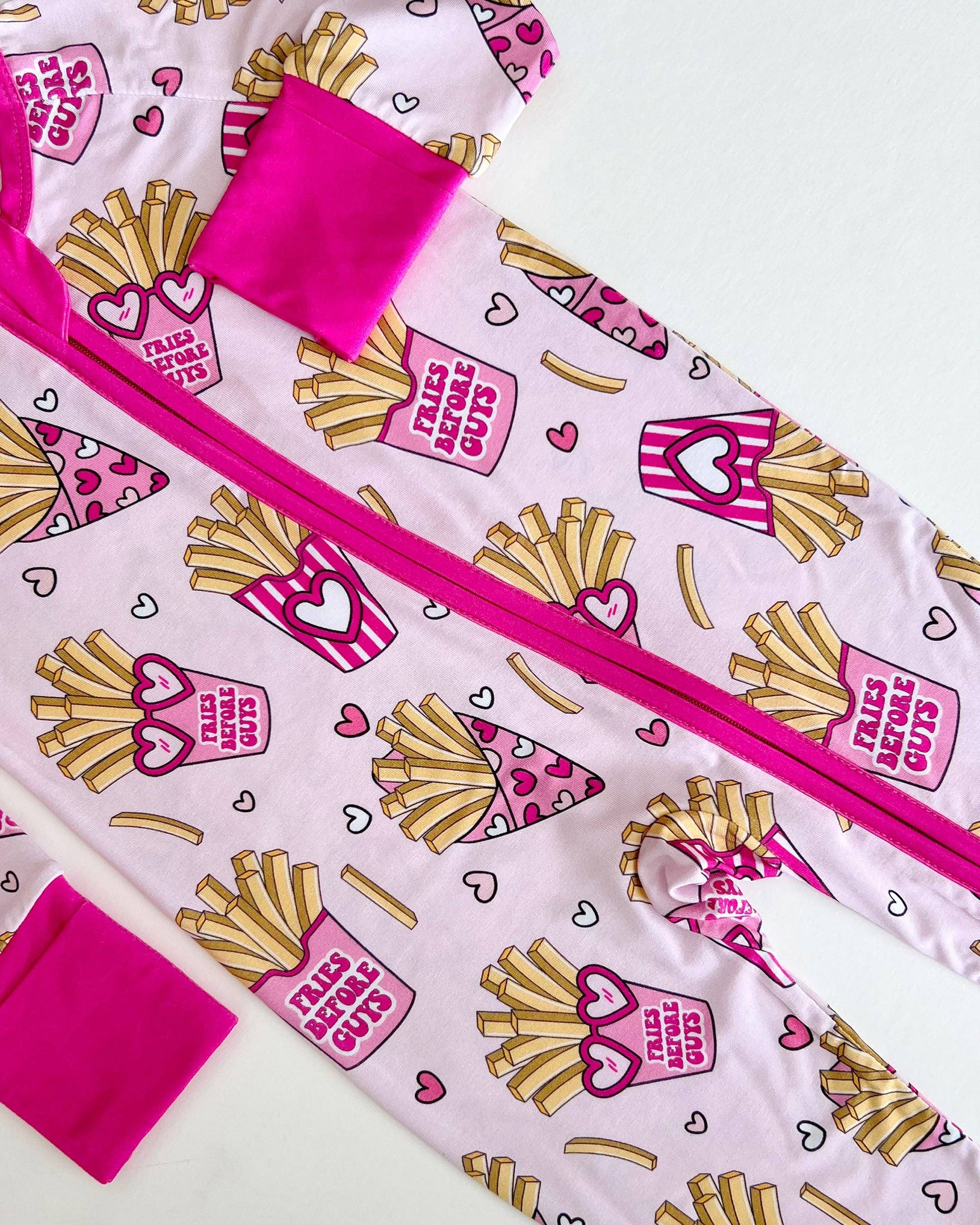 Celebrate love and laughs with the Lucky Panda Kids Bamboo Zip Romper featuring the exclusive "Fries Before Guys" print. Made from ultra-soft bamboo fabric, it’s naturally hypoallergenic and moisture-wicking to keep your little one comfy all day. The romper includes fold-over mittens and footies for extra coziness, while the two-way zip closure makes dressing quick and easy.