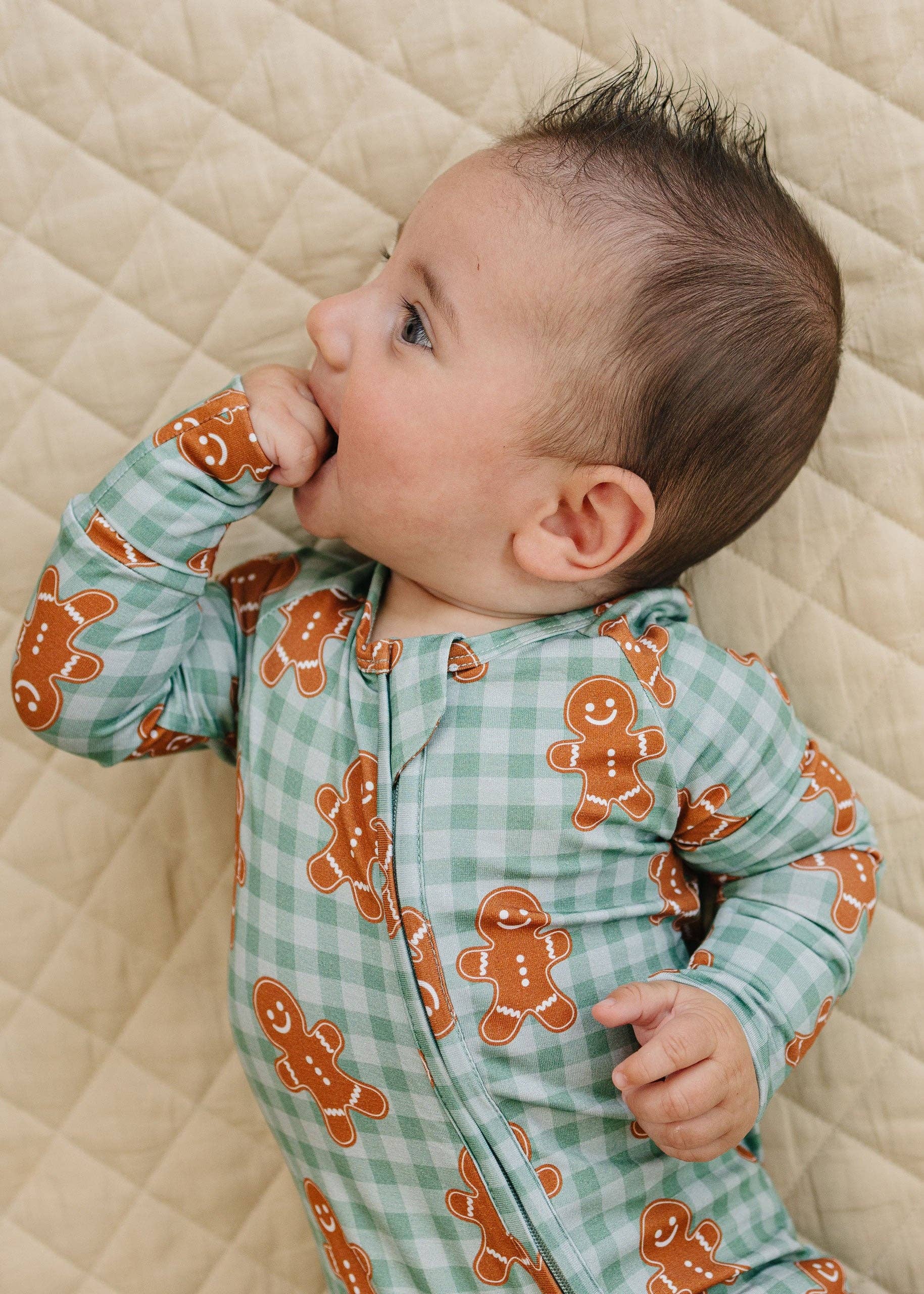The Bamboo Zip Romper | Gingerbread Gingham is the perfect blend of sweetness and holiday cheer. Featuring a classic gingham pattern adorned with adorable gingerbread friends, this cozy romper wraps your little one in festive warmth and comfort. Crafted from buttery soft bamboo fabric, it’s made for joyful mornings, snug cuddles, and magical nights by the Christmas tree.