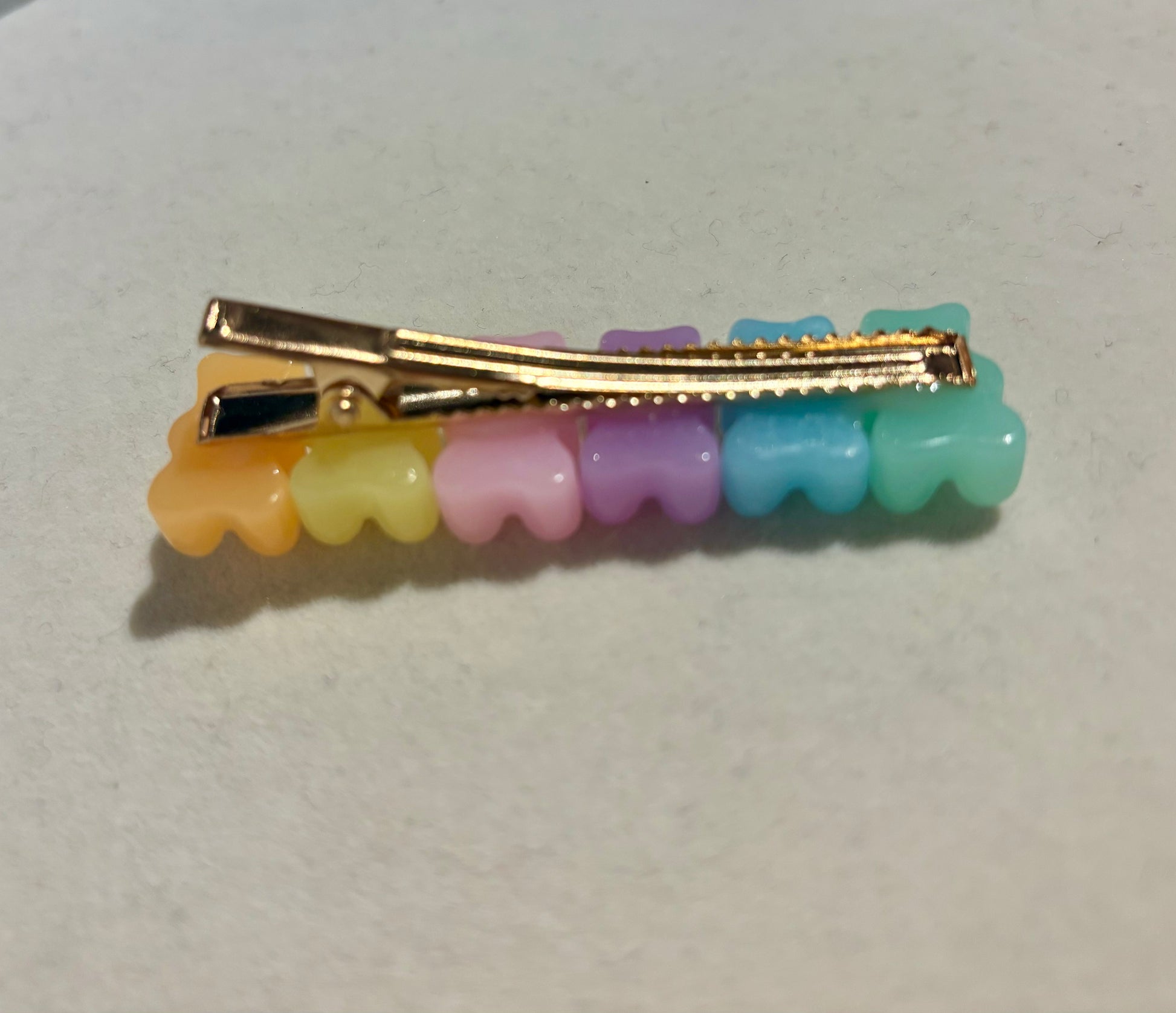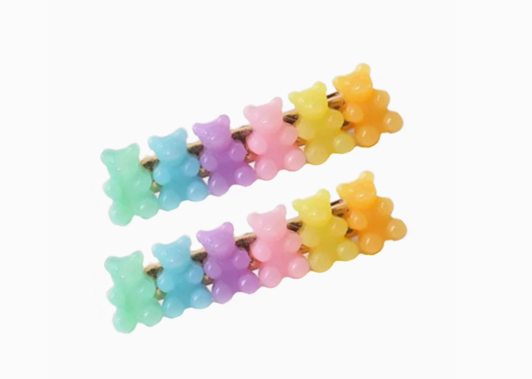 Brighten up your hairdo with the adorable Gummy Bear Pastel Hair Clips. Featuring a hinge design for easy use, these clips are adorned with six charming pastel gummy bears on the front, adding a fun and playful touch to any hairstyle.