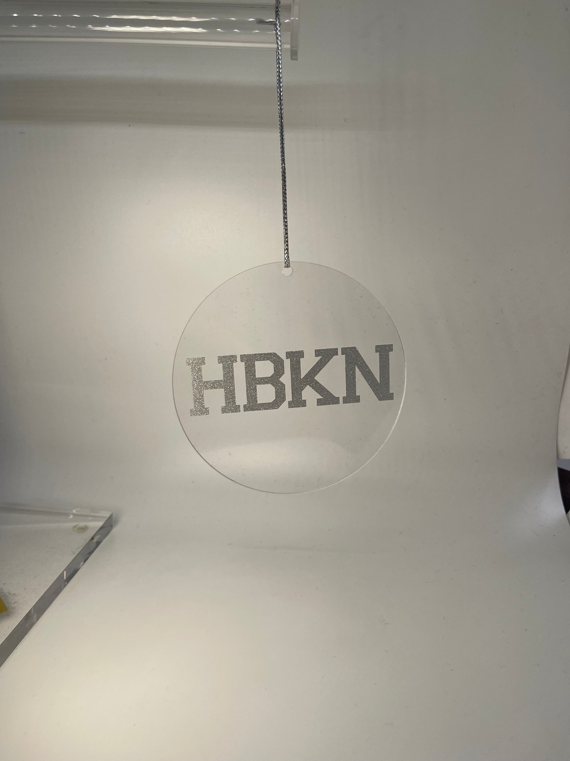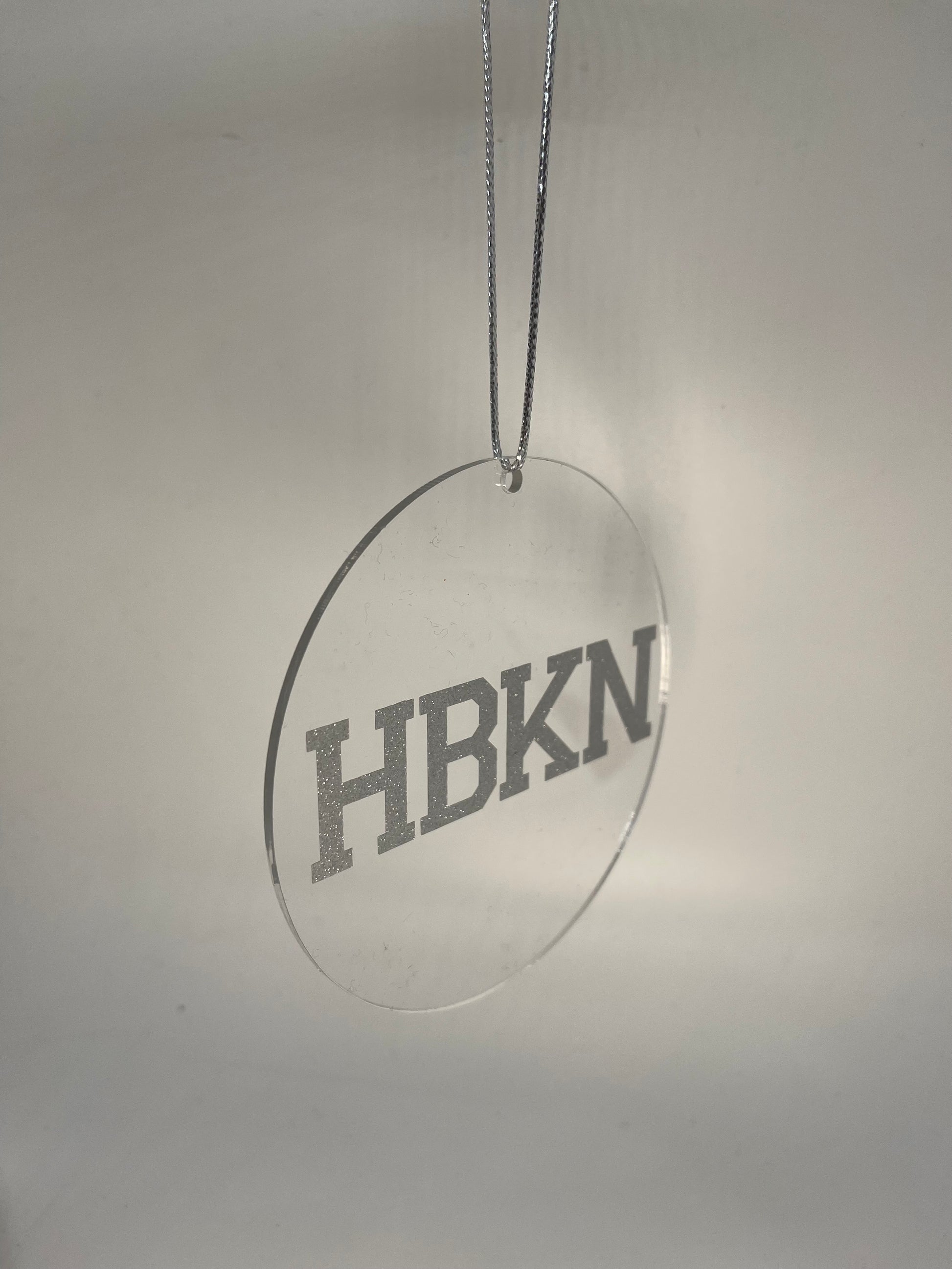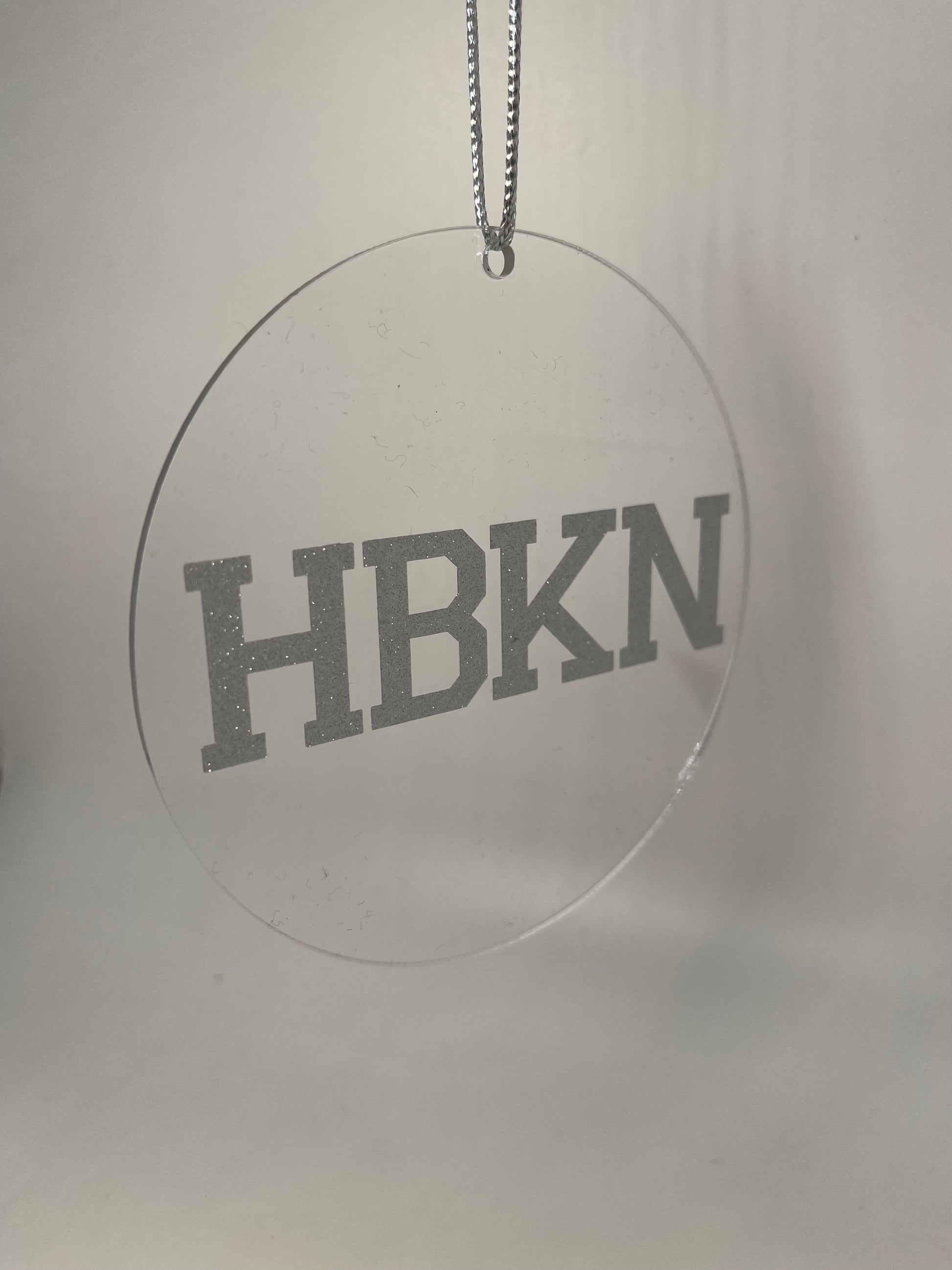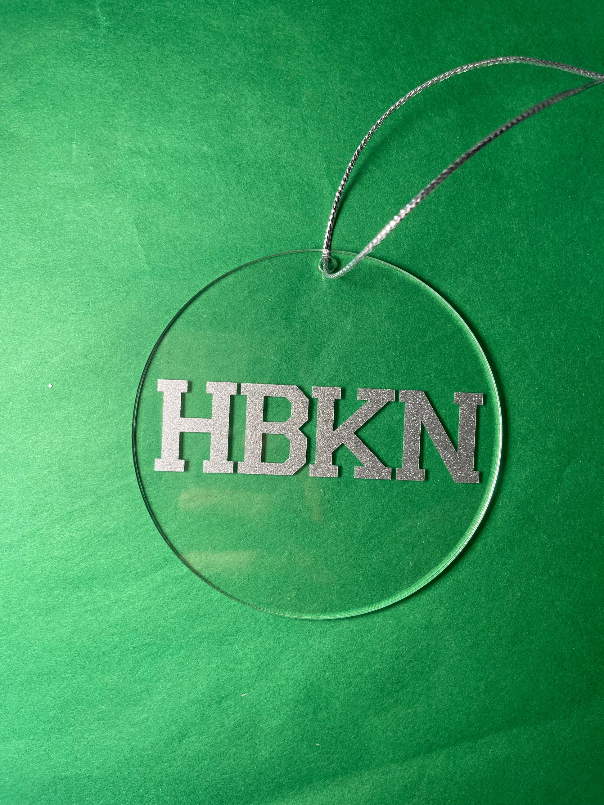 This in-house crafted ornament is a delightful addition to any holiday celebration. The acrylic circle, measuring 4" wide, features the letters "HBKN" adorned in sparkling silver glitter and comes with a silver twine for easy hanging. Perfect for gifting to friends in town, decorating your own tree, showing appreciation to teachers, or sending a heartfelt gesture to friends who have moved out of town.