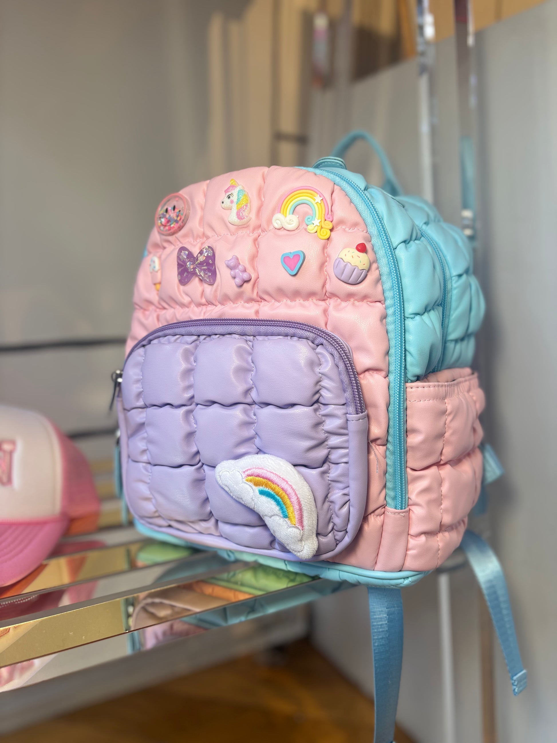 Brighten every adventure with this Kid's Smiley Confetti Charm Puffy Quilted Backpack by Bari Lynn. Covered in cheerful smiley confetti charms, its quilted design adds a fun, tactile touch. Practical details like a top handle, adjustable straps, and multiple pockets keep essentials organized and within reach. Lightweight yet roomy, this backpack makes school days and outings a joyful experience for little trendsetters.