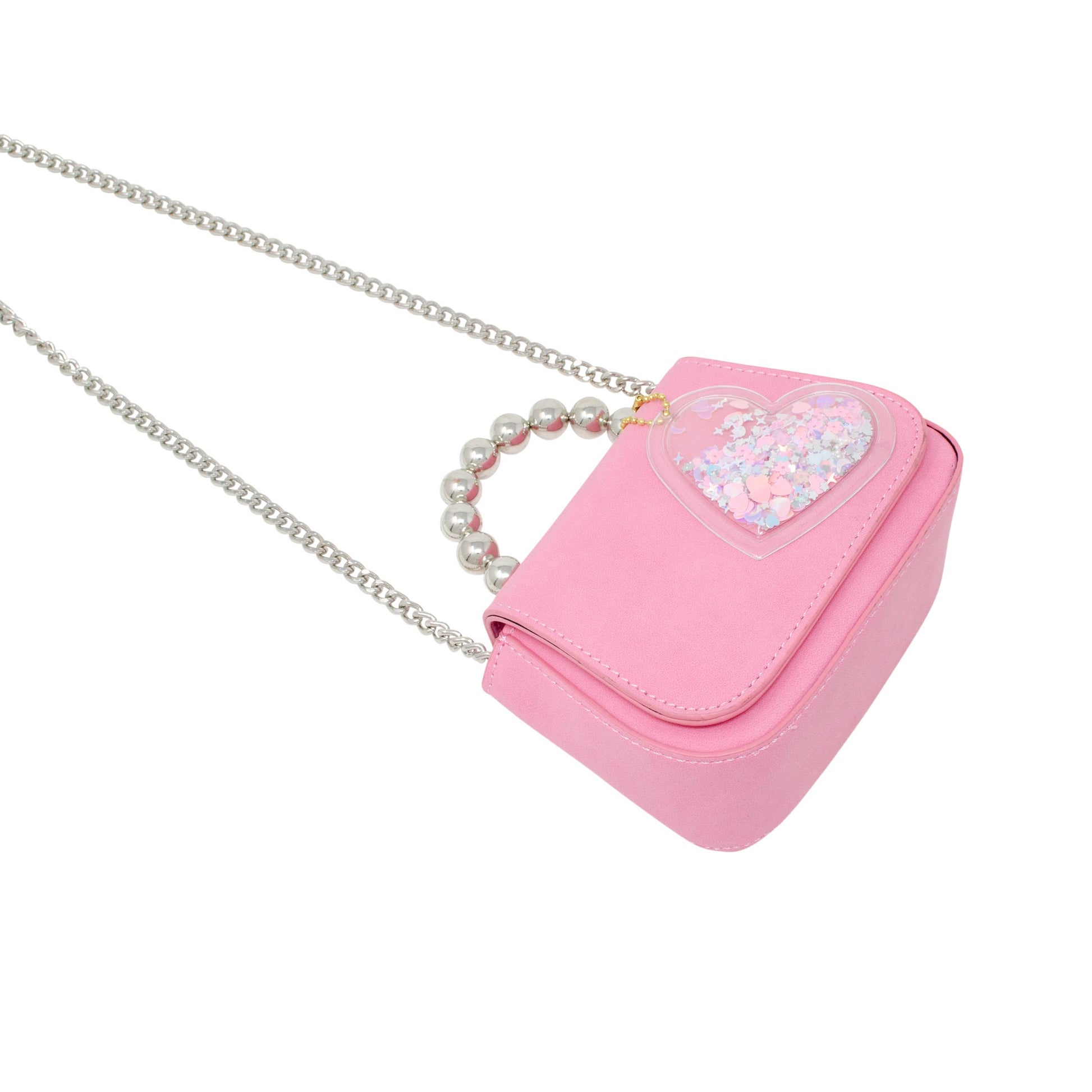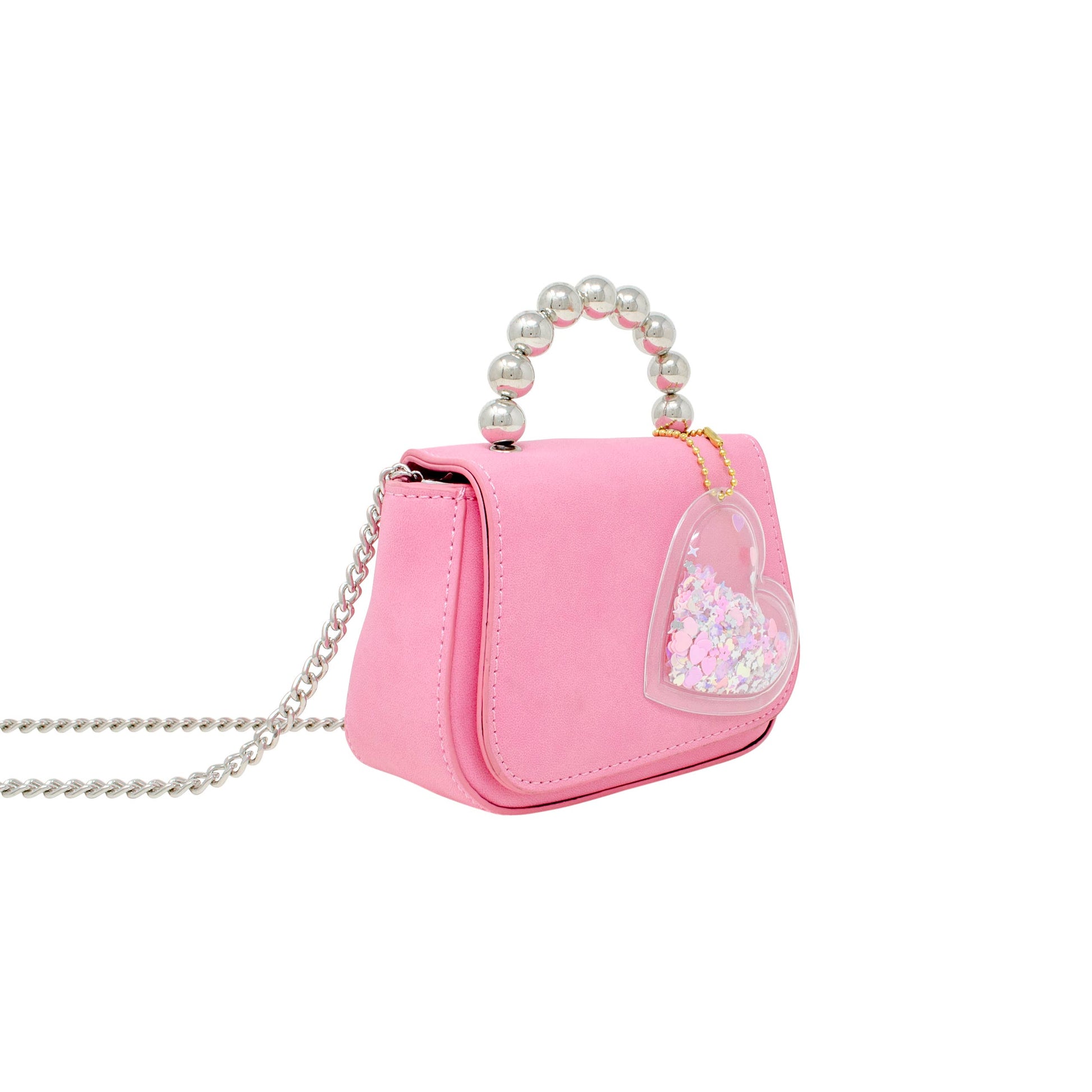 This petite yet powerful Tiny Metal Pearl Handle Handbag is perfect for chic kids on the go! With its metal pearl handle and soft suede finish, it's something special to show off. Plus, magnetic flap closure, a sweet chain strap and an adorable confetti heart charm - don't leave home without it!