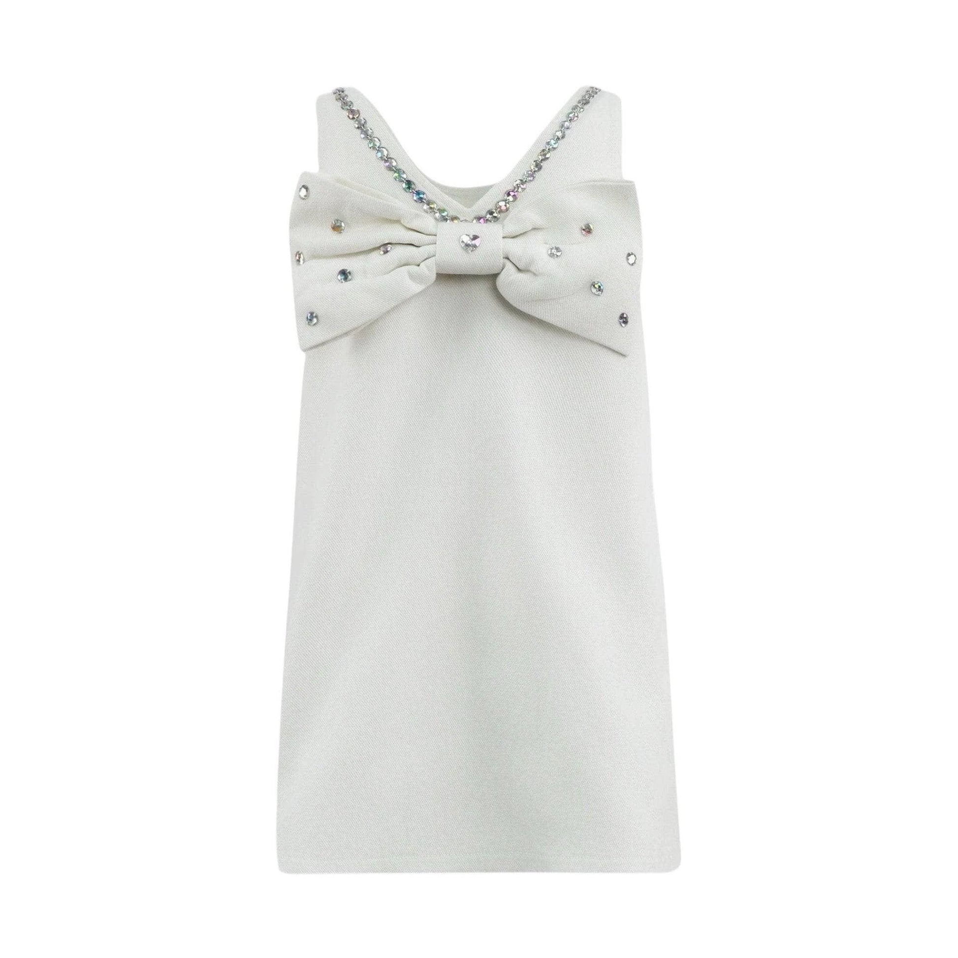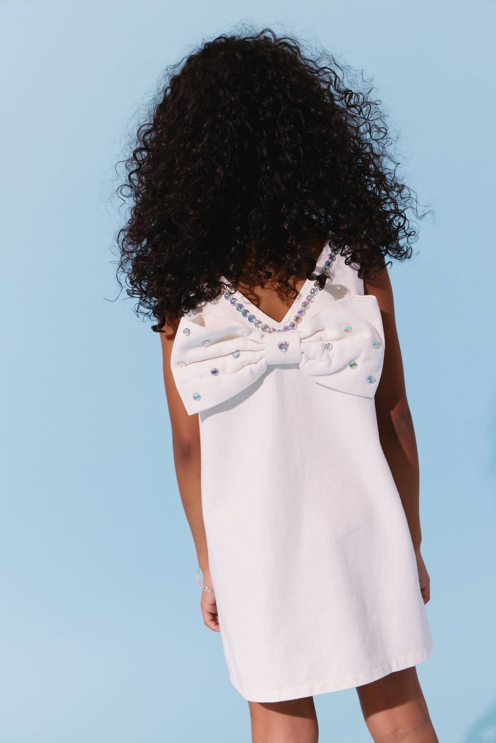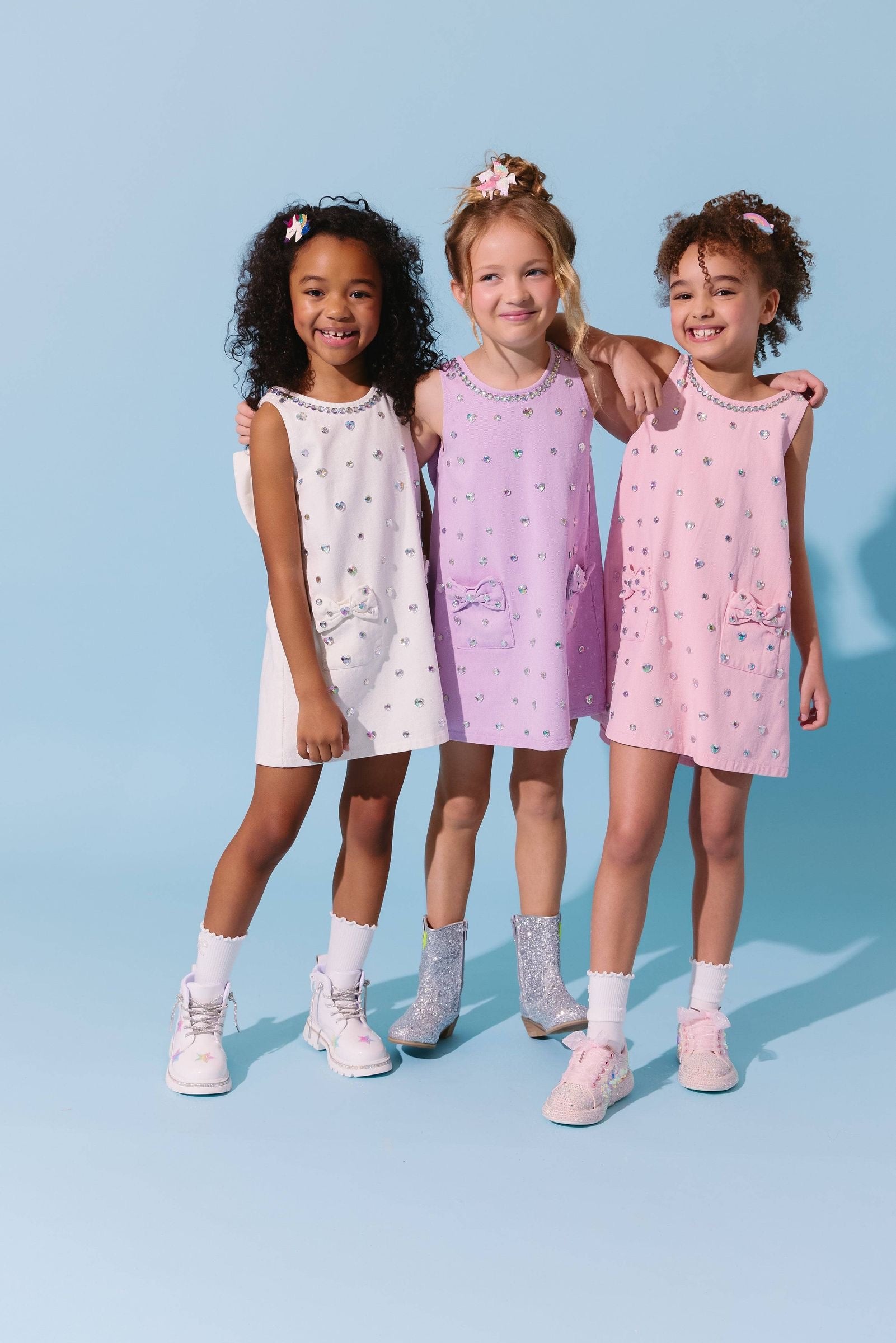 Discover the White Crystal Heart Denim Bow Dress from Lola + The Boys—a show-stopping piece designed for young fashionistas. This sparkling shift dress features shimmering rhinestone heart embellishments and a bejeweled neckline that catches the light beautifully. Practical front pockets are adorned with delicate bow details, while the sleeveless silhouette keeps it effortlessly chic. Crafted from soft, high-quality fabric for all-day comfort, it's ideal for parties, special occasions, or whenever she wants to add a touch of glamour. Hand wash cold and lay flat to dry for lasting sparkle.